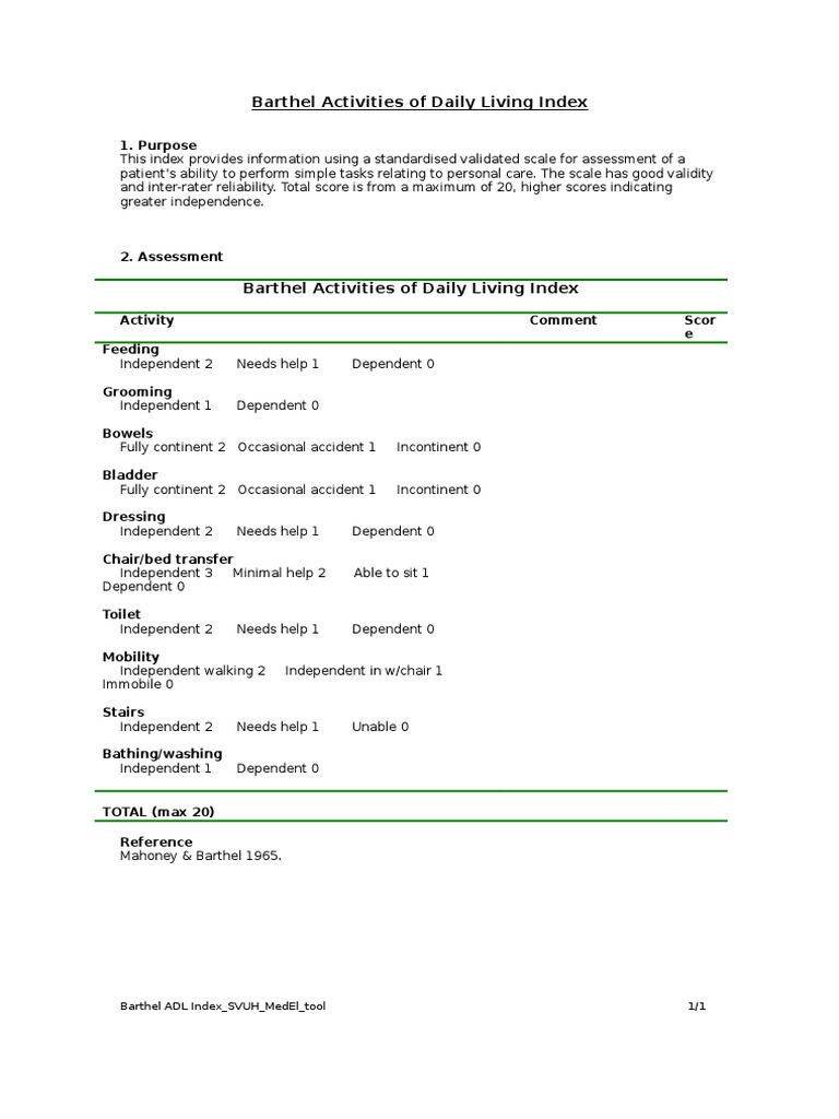 . August 2020 Page 1 of 2 Barthel Index of Activities of Daily Living Patientss ID Card No. Guidelines for the Barthel index of activities of daily living ADL 1 The index should be used as a record of what a patient does not what a patient can do. Inproceedings2005BarthelIO titleBarthel Index of Activities of Daily Living The Barthel Index of Activities of Daily Living is routinely collected by clinical staff at the hospital and will.
